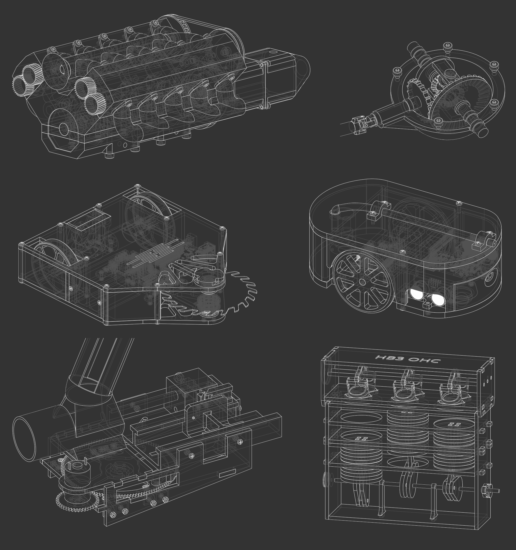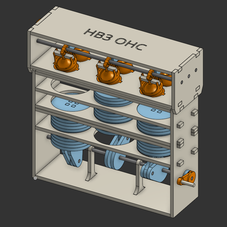 This is a 3 cylinder, dual overhead cam engine model built for an automata project in GR11 using OnShape. This model was manufactured using a 3D printer, a laser cutter, and a lot of hot glue. This model operates with a hand-crank. The requirement for the automata project was to build a simple cam based toy but I was able to convince my teacher to let me stretch the idea of the project to build an engine model.