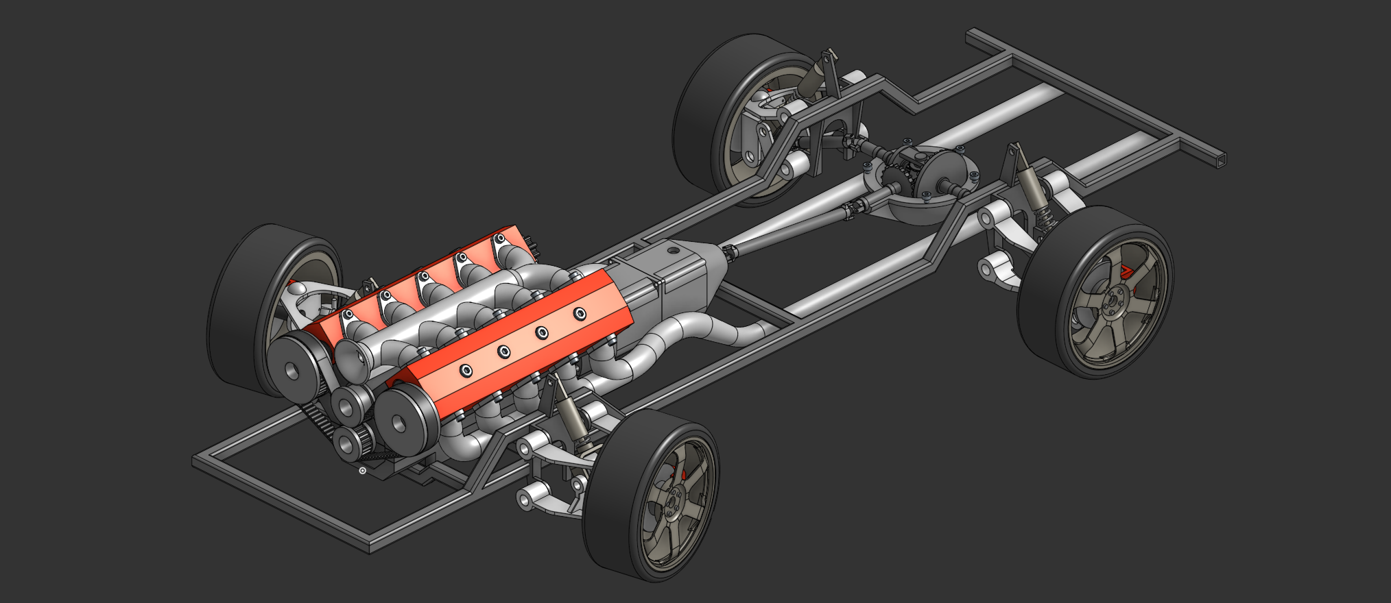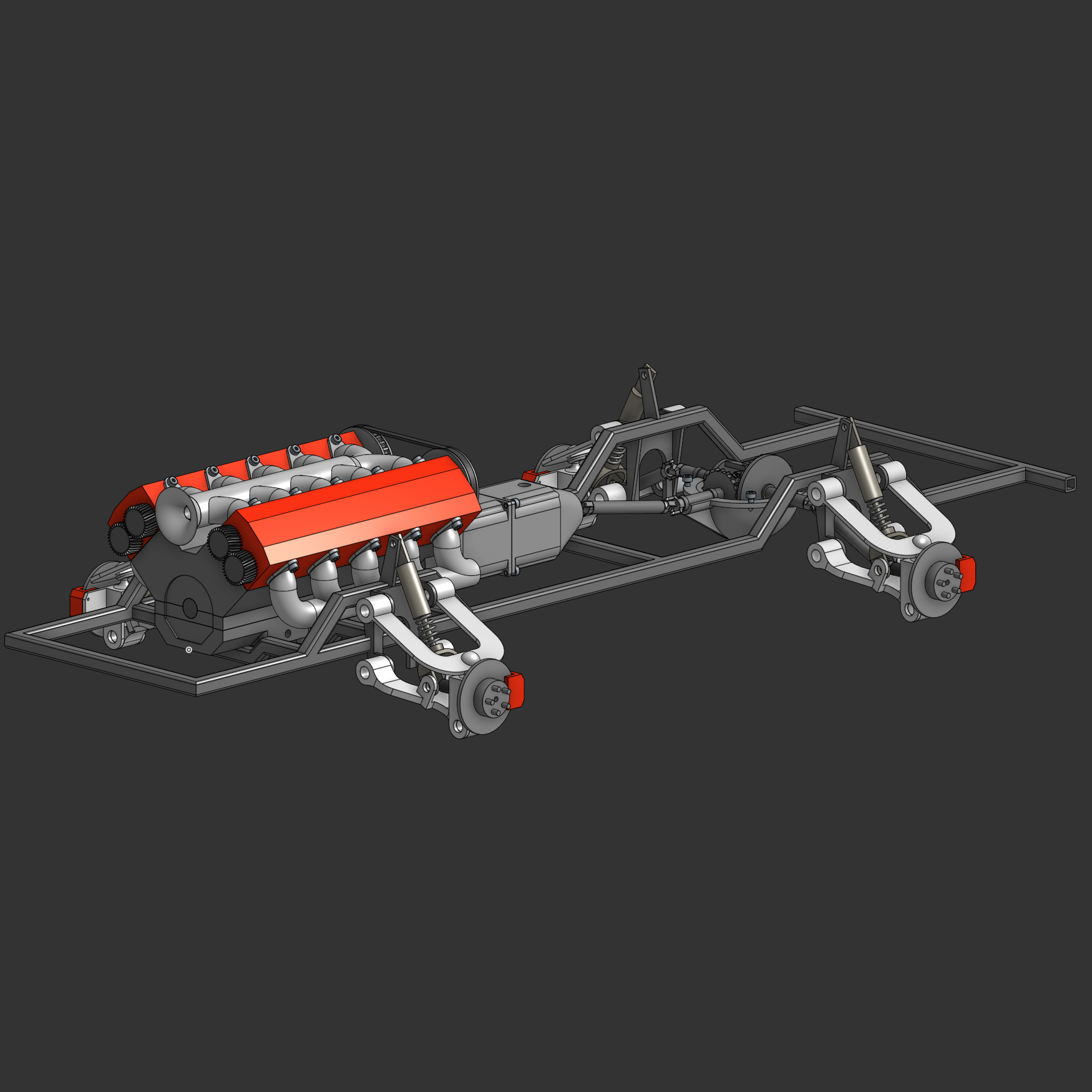 This project is quickly growing in scope as this engine is now be paired to an entire system of 3D printed drivetrain components to form an entire functioning(ish) model car. So far I have the engine connected to a transmission and a differential with the frame sitting on all around double-wishbone suspension. I am not able to find affordable methods to manufacture my engine so I have stopped at assembling just the engine. The engine cranks and the valves rotate but not nearly smooth enough to run off of compressed air. I will proudly blame my Ender 3 for it's poor print qualities.