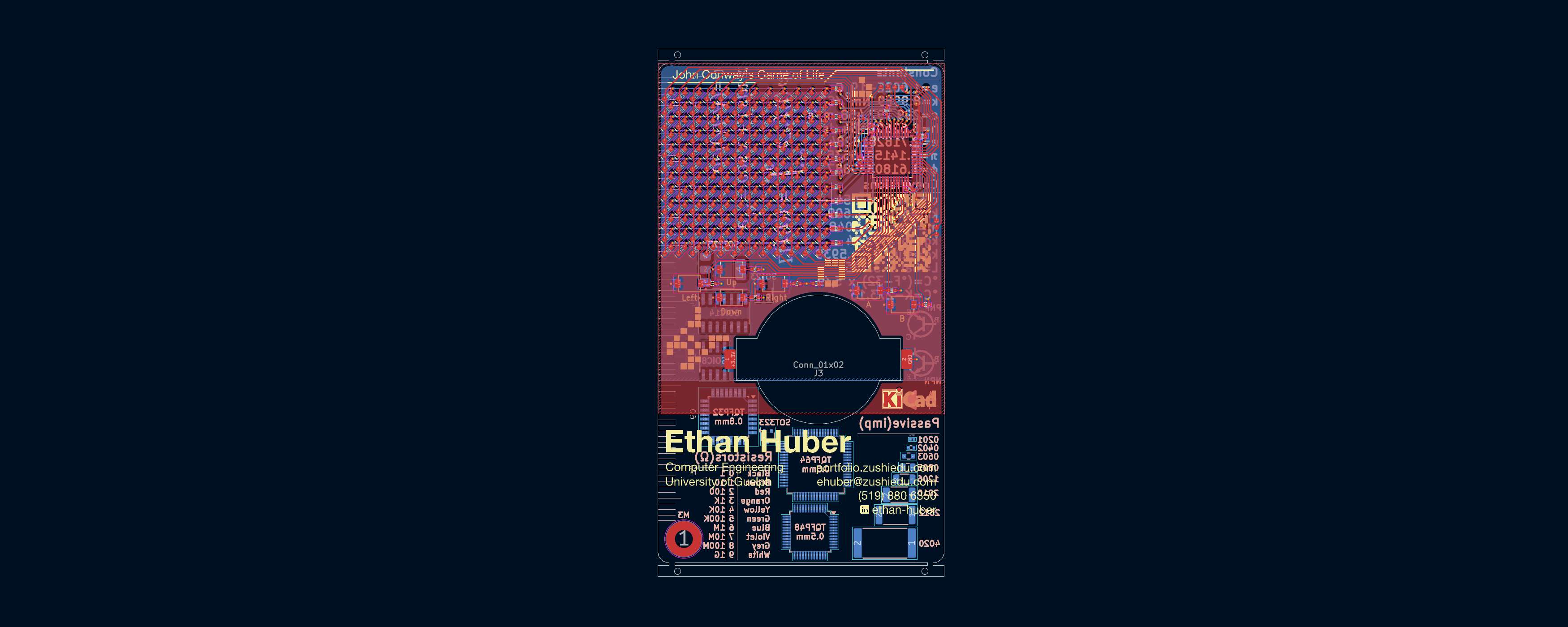 Some cool patterns are printed across the front of the PCB. The QR code to my portfolio, and some contact info is also on the front of the PCB.