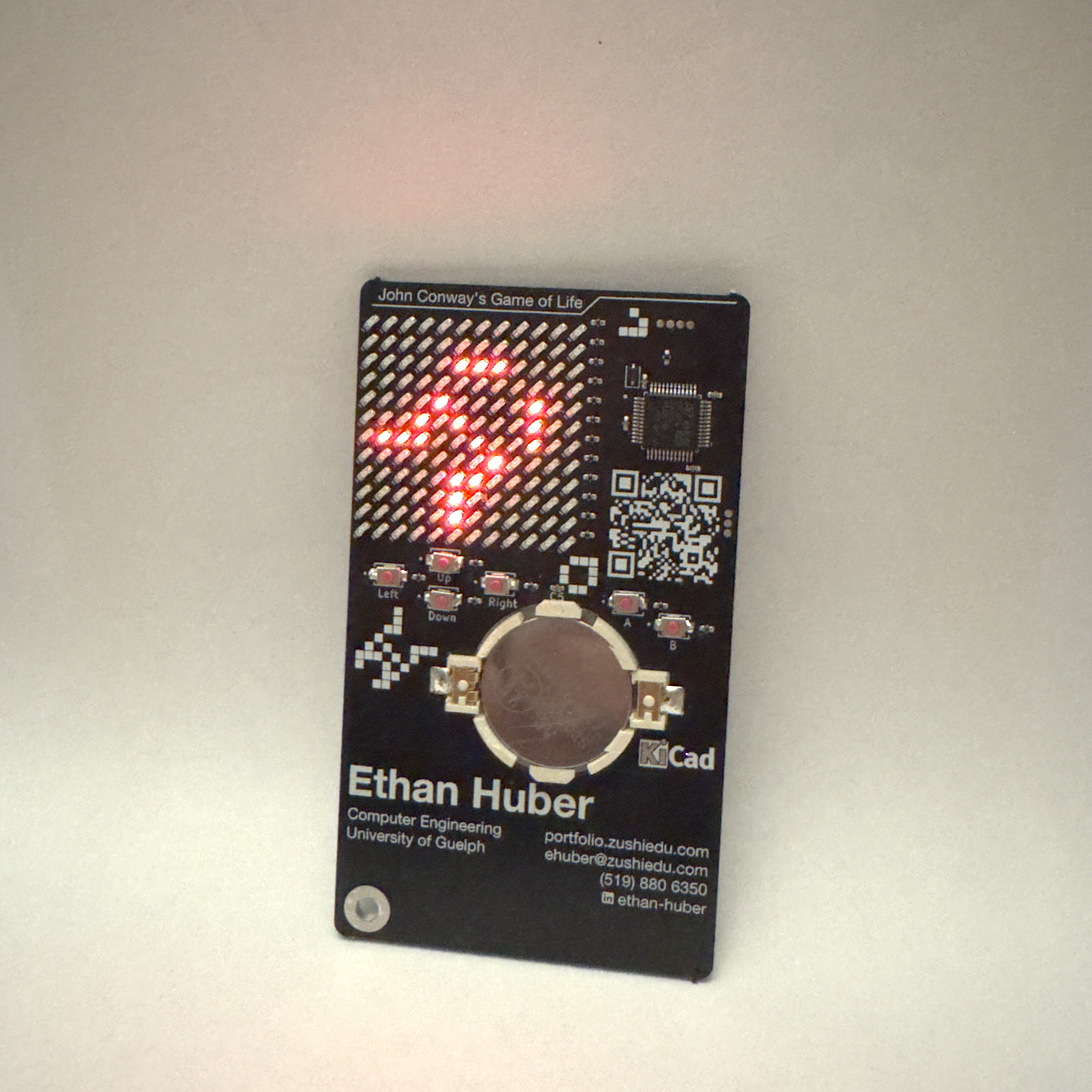 The business card has a collection of common engineering related symbols, values, equations, and footprints on the back. The STM32 is programmed to simulate John Conway's Game of Life.