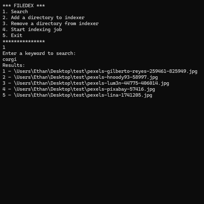 Finally, once the indexer is done, select 1. Search to search. Filedex will try its best to relate your keyword(s) to files it has seen. Search results will vary from machine to machine and from run to run. This is because results from the LLM used is fairly random. The search tool is limited to 20 results. The results will automatically be sorted from most relevant to least. The relevancy is identified by the LLM so accuracy may be poor.