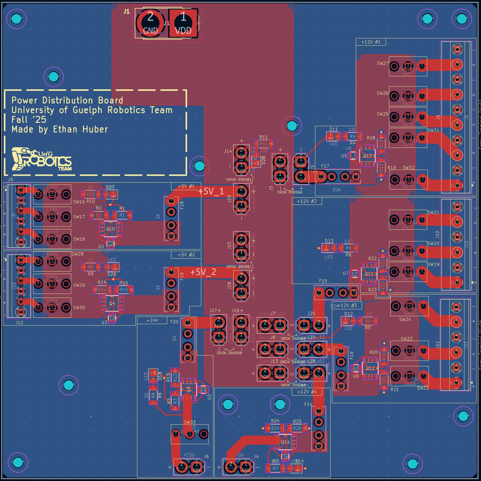 The power distribution board is a reliable and organized solution for managing power delivery to the UofG's rover's modules. The board was designed in KiCad, and supports and allocates power to various modules including some notable ones such as the Light, Arm, Fan, and Antenna boards. Each output was designed with its unique requirements in mind, ensuring correct routing and current capacity across all connections.